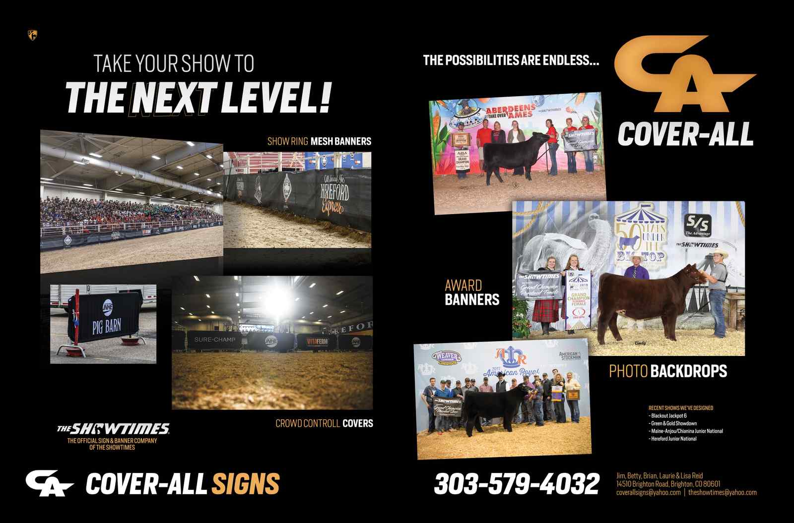 Have The Showtimes design your next project! We offer industry leading graphic design for Ads, Banners, Sale Directories, Logos, Photo Backdrops, Product Labels and much more! We've worked with many of the biggest names in the business including the American Junior Maine-Anjou Association, Sullivan Supply, Rodgers Bulls, Sunglo, American Royal, Junior National Hereford Expo, Aksarben, Bonham Show Cattle, Goretska Show Steers, Chad Walker Livestock Co., Blue Team Wethers, Show Coat, Willow Springs, Natural Solutions, Blackout Jackpot and many others! The Showtimes was voted Best Graphic Designer back-to-back in the Best of the Barns Awards! Contact us today to get the Showtimes Effect for your next project!