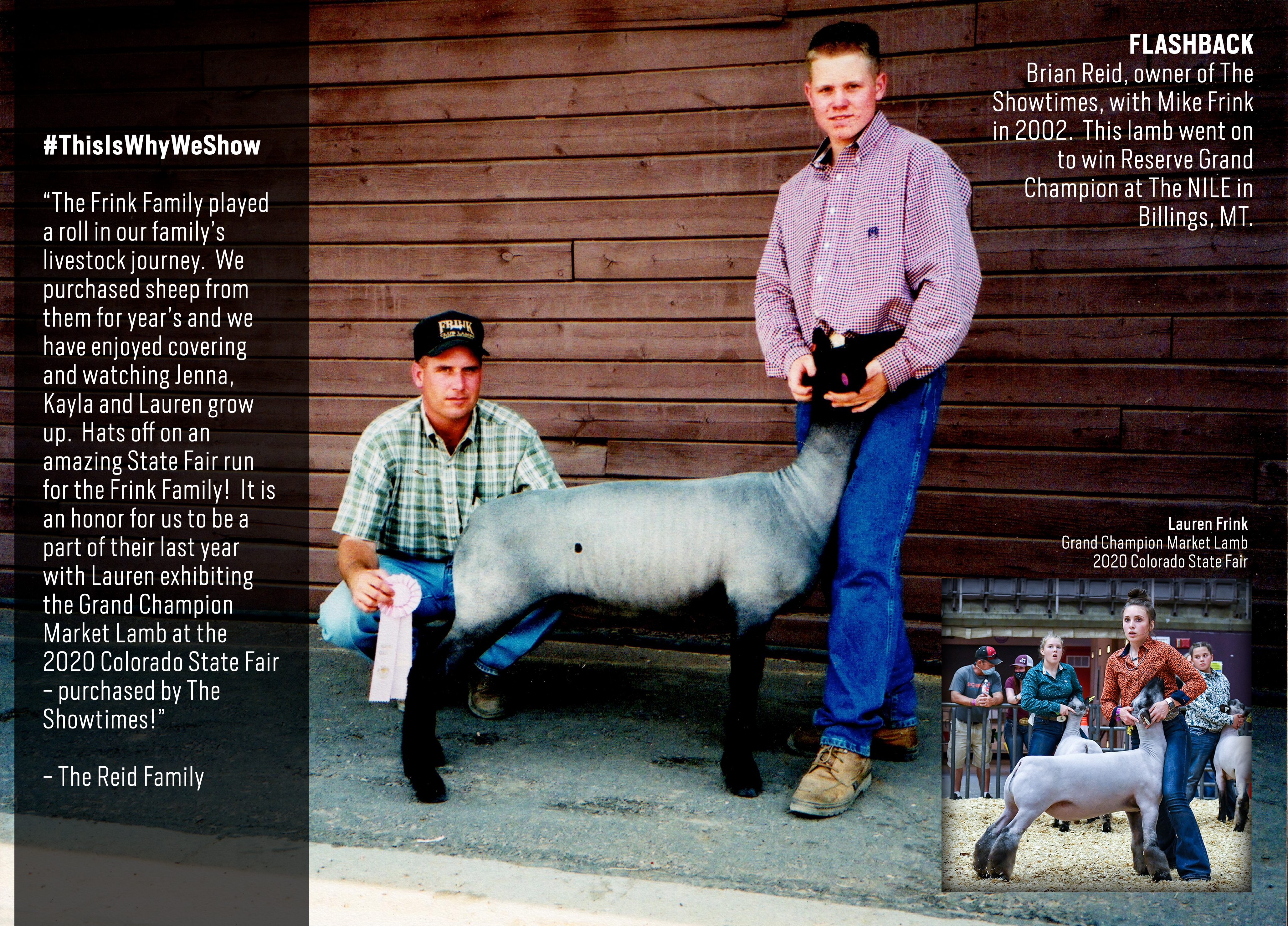 "The Frink Family played a roll in our family’s livestock journey. We purchased sheep from them for year’s and we have enjoyed covering and watching Jenna, Kayla and Lauren grow up. Hats off on an amazing State Fair run for the Frink Family! It is an honor for us to be a part of their last year with Lauren exhibiting the Grand Champion Market Lamb at the 2020 Colorado State Fair - purchased by The Showtimes!"